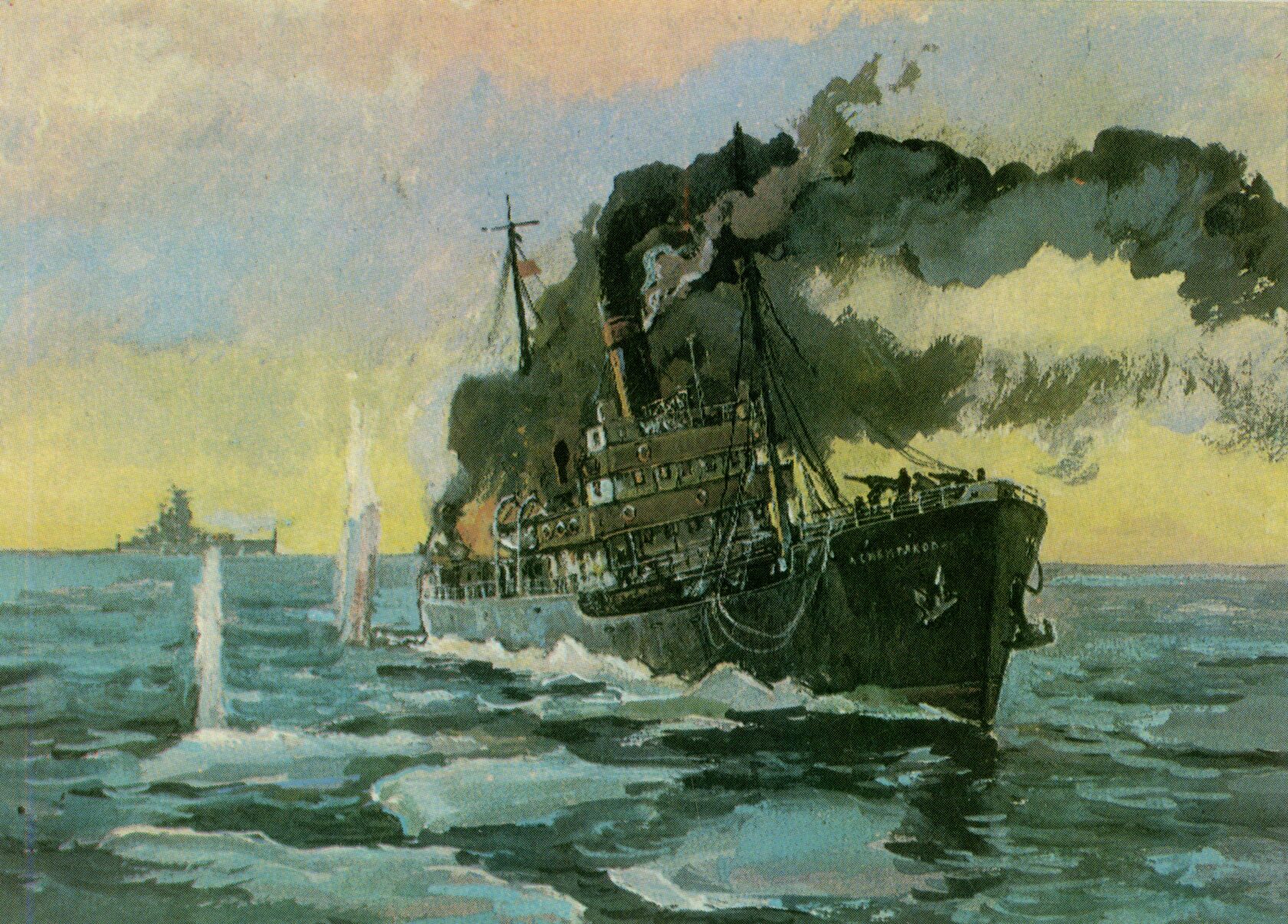 Открытка "Полярный "Варяг" с изображением боя парохода "Александр Сибиряков" с немецким тяжёлым крейсером "Адмирал Шеер". Художник П. П. Павлинов.