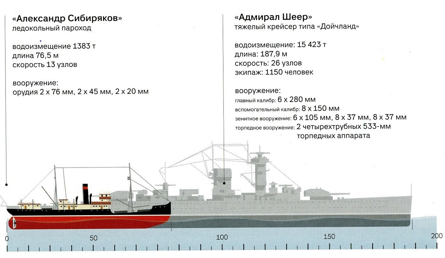 Сравнение размеров ледокольного парохода «Александр Сибиряков» и тяжелого крейсера «Адмирал Шеер».